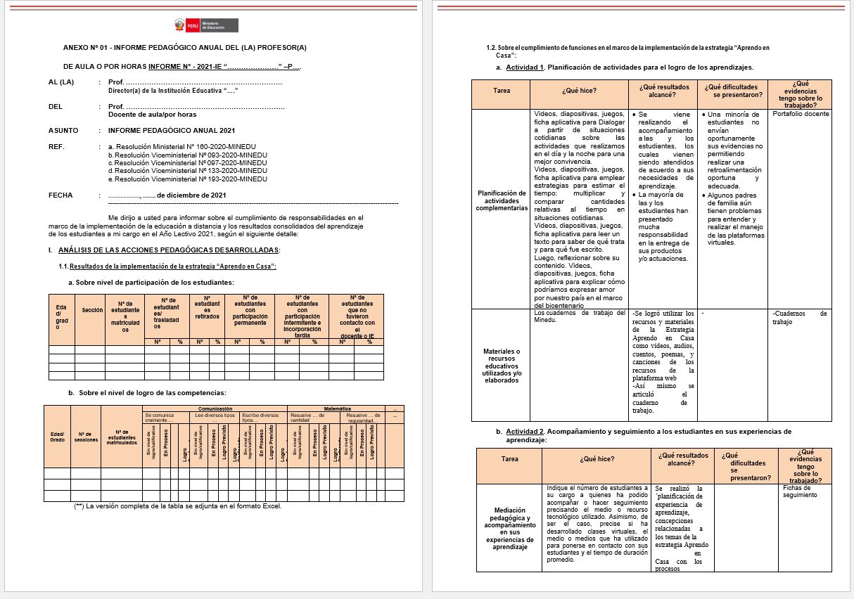 Informar sobre el cumplimiento de responsabilidades en el marco de la implementación de la educación a distancia y los resultados consolidados del aprendizaje de los estudiantes a mi cargo en el Año Lectivo 2021.