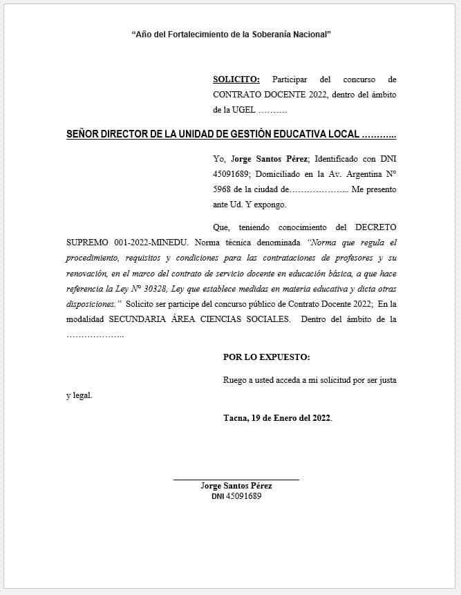 Que, teniendo conocimiento del DECRETO SUPREMO 001-2022-MINEDU. Norma técnica denominada “Norma que regula el procedimiento, requisitos y condiciones para las contrataciones de profesores y su renovación, en el marco del contrato de servicio docente en educación básica, a que hace referencia la Ley N° 30328, Ley que establece medidas en materia educativa y dicta otras disposiciones.” Solicito ser participe del concurso público de Contrato Docente 2022; En la modalidad SECUNDARIA ÁREA CIENCIAS SOCIALES. Dentro del ámbito de la ………………..