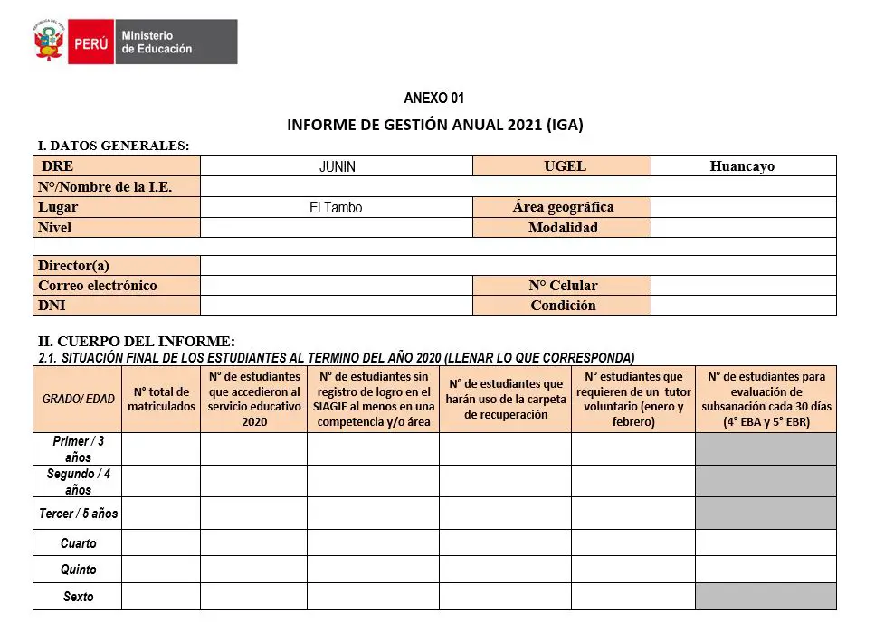 II. CUERPO DEL INFORME: 2.1. SITUACIÓN FINAL DE LOS ESTUDIANTES AL TERMINO DEL AÑO 2020 (LLENAR LO QUE CORRESPONDA) GRADO/ EDAD N° total de matriculados N° de estudiantes que accedieron al servicio educativo 2020 N° de estudiantes sin registro de logro en el SIAGIE al menos en una competencia y/o área N° de estudiantes que harán uso de la carpeta de recuperación N° estudiantes que requieren de un tutor voluntario (enero y febrero) N° de estudiantes para evaluación de subsanación cada 30 días (4° EBA y 5° EBR)