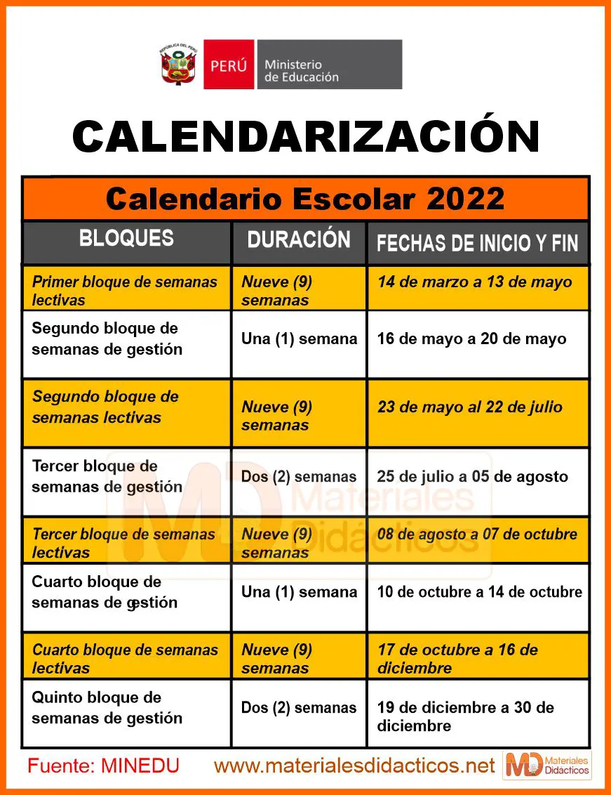 Cabe señalar que las Direcciones Regionales de Educación, o las que hagan sus veces, en el ámbito de sus competencias, pueden determinar fechas diferentes siempre que se cumpla con el número mínimo de semanas de cada tipo; es decir, treinta y seis (36) semanas lectivas y ocho (8) semanas de gestión distribuidas en el año 2022. Esta organización puede plasmarse en las instituciones educativas bajo la forma de bimestres, trimestres u otras formas de organización del tiempo que estimen convenientes.