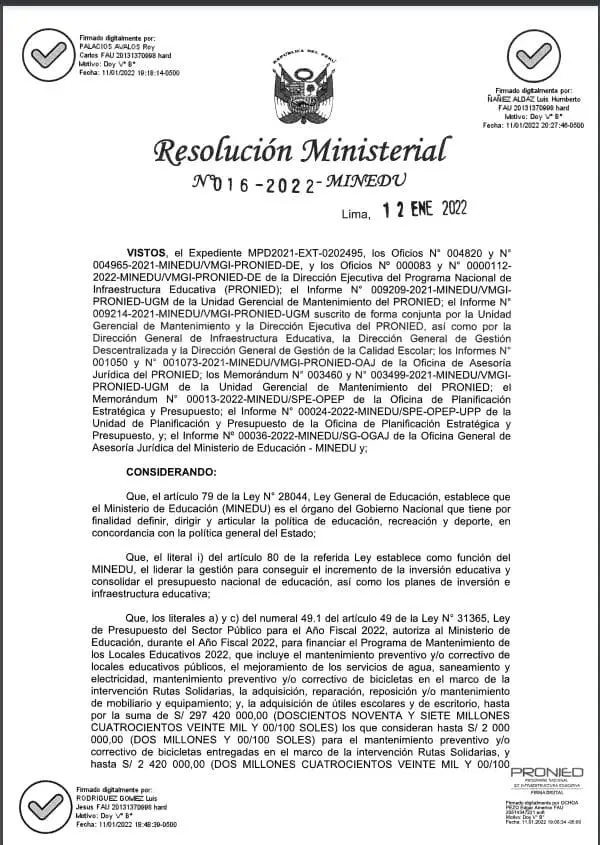 VISTOS, el Expediente MPD2021-EXT-0202495, los Oficios N° 004820 y N° 004965-2021-MINEDU/VMGI-PRONIED-DE, y los Oficios Nº 000083 y N° 0000112-2022-MINEDU/VMGI-PRONIED-DE de la Dirección Ejecutiva del Programa Nacional de Infraestructura Educativa (PRONIED); el Informe N° 009209-2021-MINEDU/VMGI-PRONIED-UGM de la Unidad Gerencial de Mantenimiento del PRONIED; el Informe N° 009214-2021-MINEDU/VMGI-PRONIED-UGM suscrito de forma conjunta por la Unidad Gerencial de Mantenimiento y la Dirección Ejecutiva del PRONIED, así como por la Dirección General de Infraestructura Educativa, la Dirección General de Gestión Descentralizada y la Dirección General de Gestión de la Calidad Escolar; los Informes N° 001050 y N° 001073-2021-MINEDU/VMGI-PRONIED-OAJ de la Oficina de Asesoría Jurídica del PRONIED; los Memorándum N° 003460 y N° 003499-2021-MINEDU/VMGI-PRONIED-UGM de la Unidad Gerencial de Mantenimiento del PRONIED; el Memorándum N° 00013-2022-MINEDU/SPE-OPEP de la Oficina de Planificación Estratégica y Presupuesto; el Informe N° 00024-2022-MINEDU/SPE-OPEP-UPP de la Unidad de Planificación y Presupuesto de la Oficina de Planificación Estratégica y Presupuesto, y; el Informe Nº 00036-2022-MINEDU/SG-OGAJ de la Oficina General de Asesoría Jurídica del Ministerio de Educación - MINEDU y;