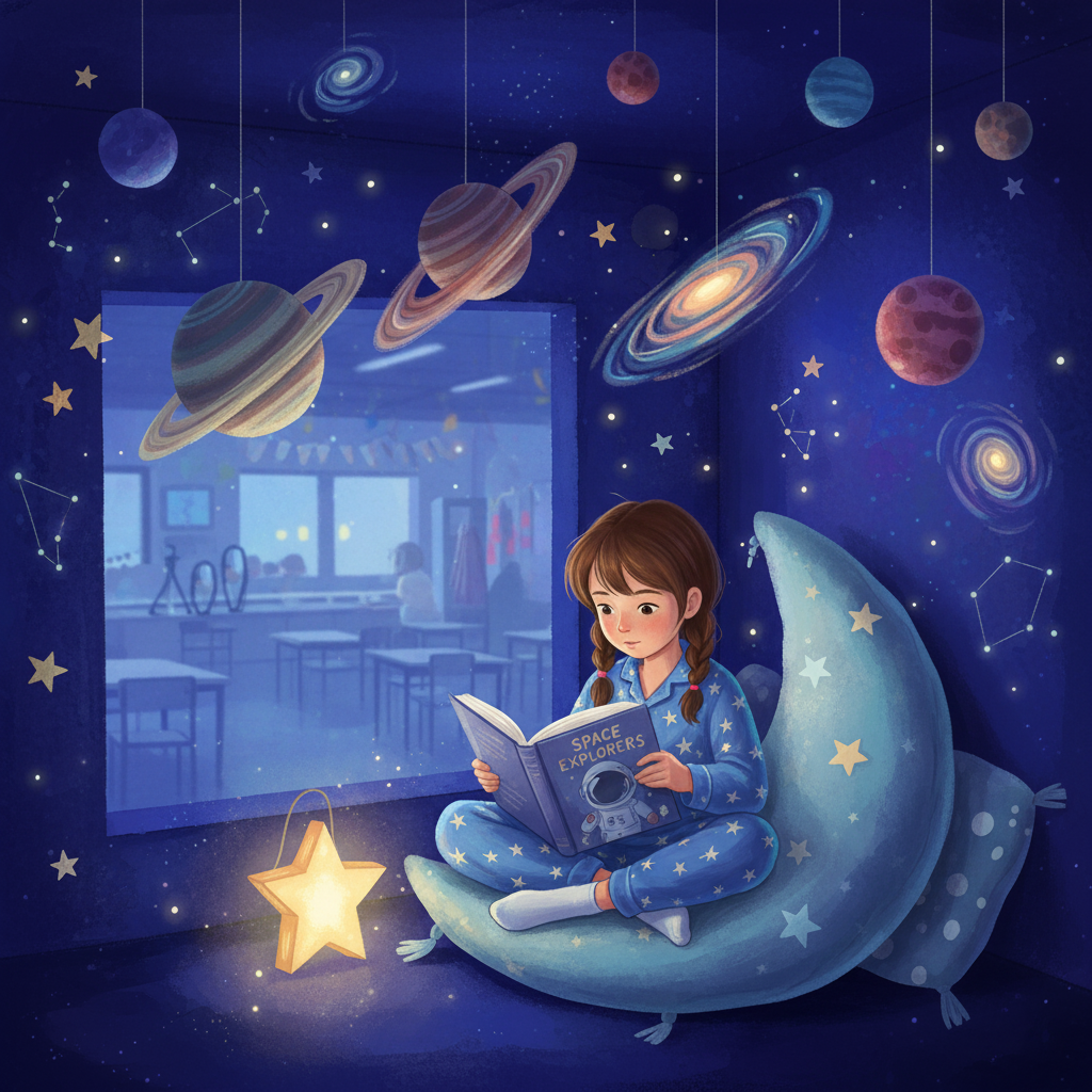 - Elementos temáticos: Puedes decorar el rincón basándote en un tema que rote mensualmente: el espacio, los dinosaurios, el fondo del mar… Esto te permite destacar libros relacionados y mantener el espacio siempre fresco y emocionante.
